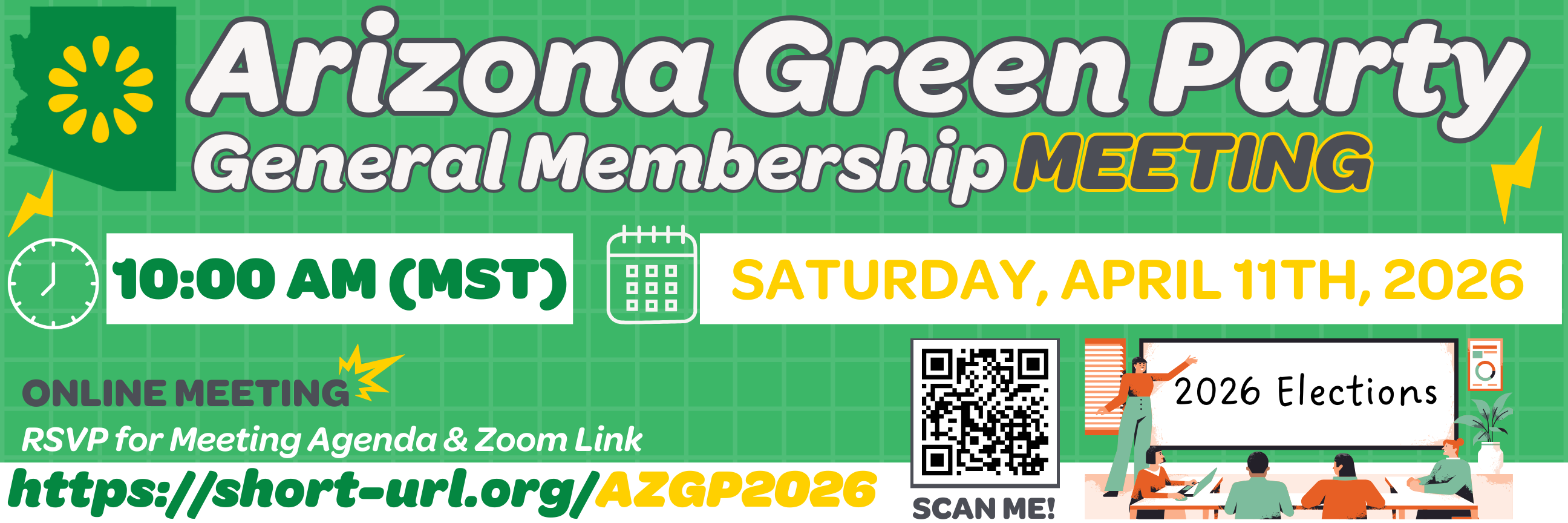 THE ARIZONA GREEN PARTY, ("AZGP"), founded in May of 1990, is the officially recognized and accredited affiliate chapter of the Green Party of the United States for the State of Arizona. Our party is currently the 5th largest political party in AZ, with over 3,000 registered Green Party voters statewide and 3 local county chapters that are currently active in Maricopa, Pima, and Coconino Counties. Starting in 1992, the AZGP has run over 90 candidates in partisan and nonpartisan races every election cycle since our founding, and has had a total of 5 AZGP members thus far who have been either elected or appointed to public offices up and down the ballot in Arizona.